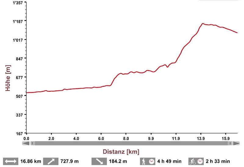 Distanz 16.8 km - 728 m aufwärts - 185 m abwärts (effekt. Werte: + 896m -429m)