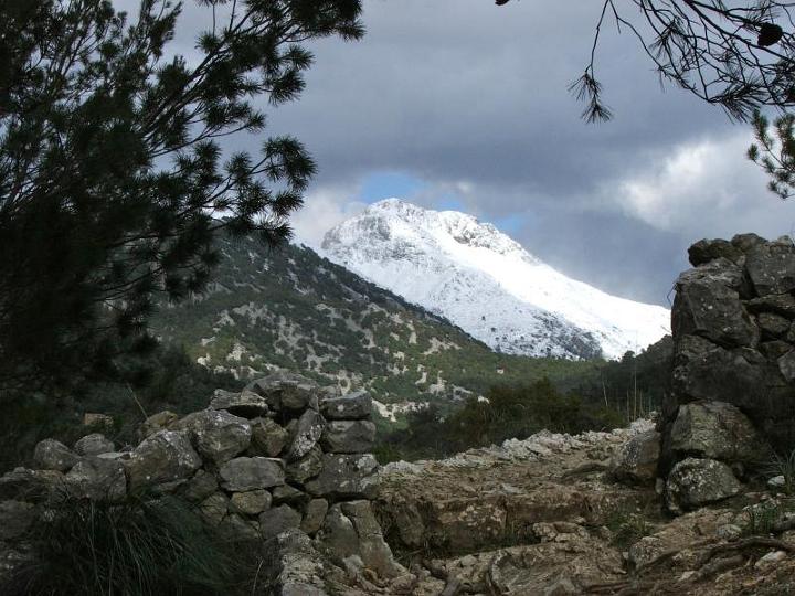 Auf dem Weg zum Coll de sa Bassola mit dem schneebedeckten Puig de Massanella im Hintergrund