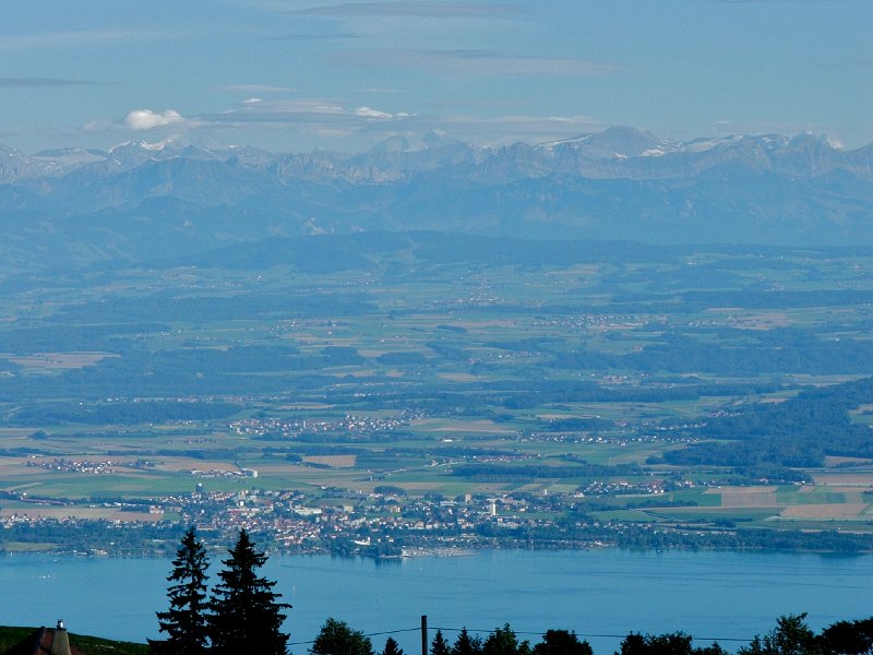 Estavayer-le-Lac, Payerne im Hintergrund die Freiburger Alpen.