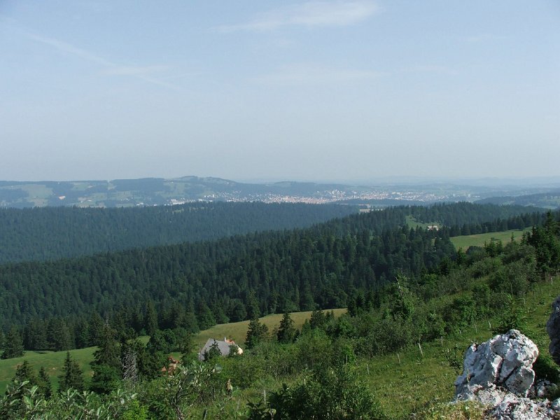 Blick von "Les Rochers Bruns" auf 1400m hinunter nach la Chaux de Fonds