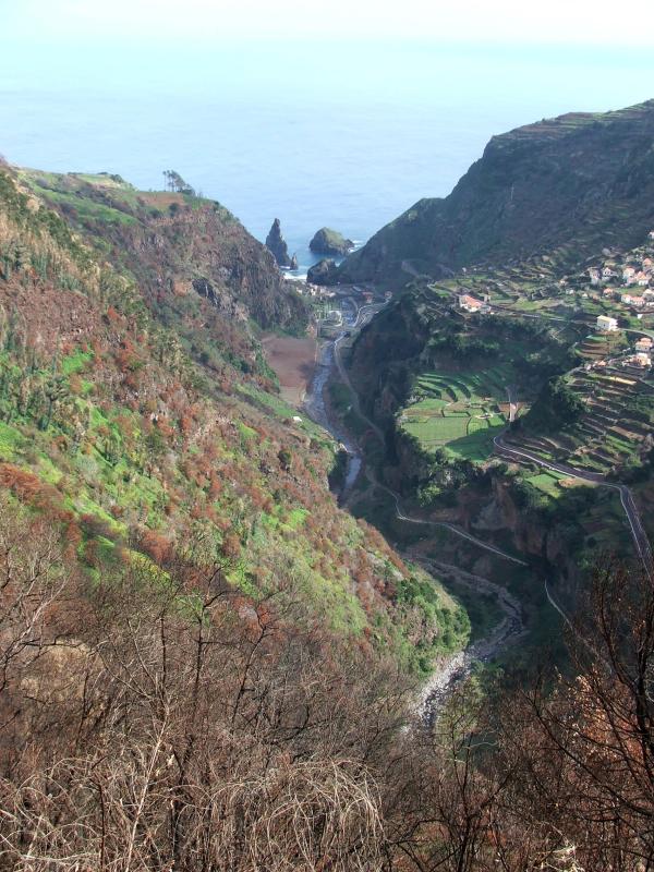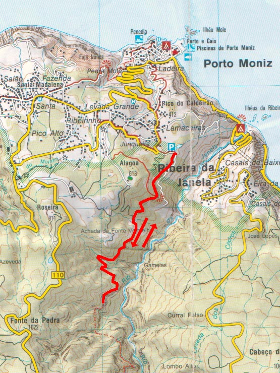 Kurz vor Porto Moniz erreichen wir das Levadahaus bei Lamaceiros - ein modern hergerichteter Picknickplatz mit Feuerstelle und kleiner Parkanlage - an diesem Sonntag gut besetzt. Gegenüber von Ribeira da Janela führt der Weg der "Levada da Central" entlang, hinein ins Tal das bei Rabaçal in der Hochebene Paúl da Serra beginnt. |