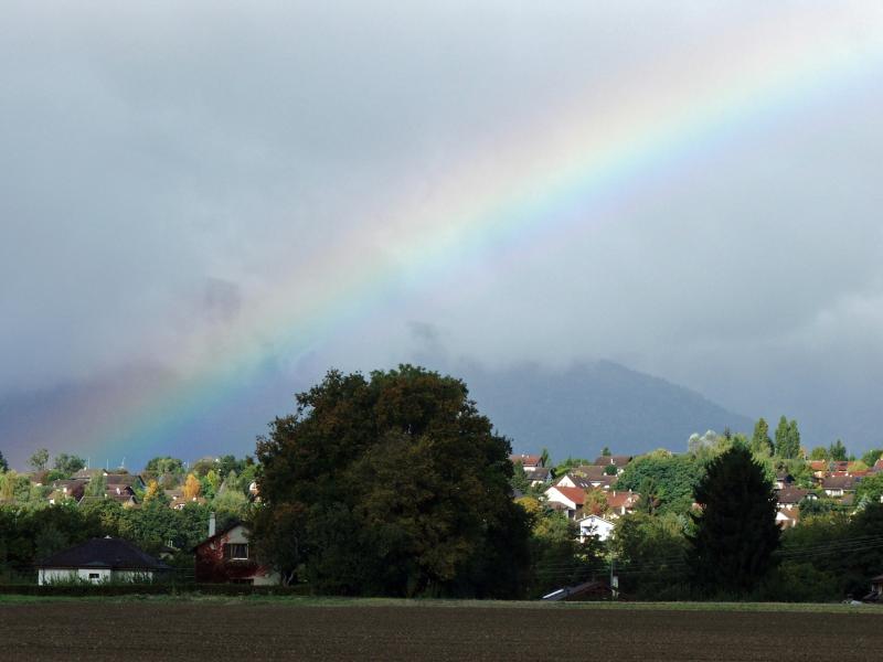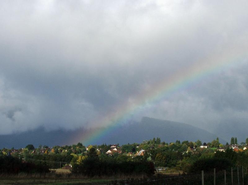 Schnell hellt es auf, Regenbogen, dunkle Wolkenreste, blauer Himmel... | |||