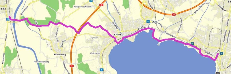 Diese erste Etappe ist eigentlich Abschnitt Nr. 10 und führt uns in knapp drei Stunden von Zug über Cham nach Sins. Gegenüber der Originalroute wählen wir einen Weg, der uns nördlich an der Agglomeration Luzern vorbei ins Entlebuch führen wird. Auf reichlich bevölkerten Uferwegen