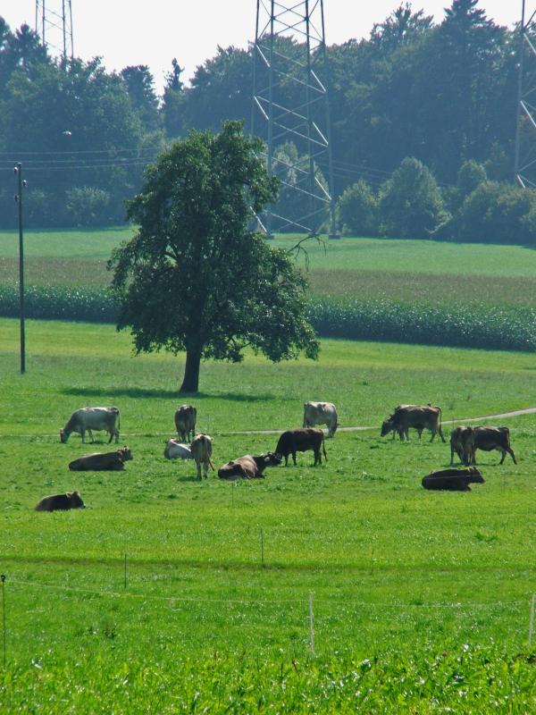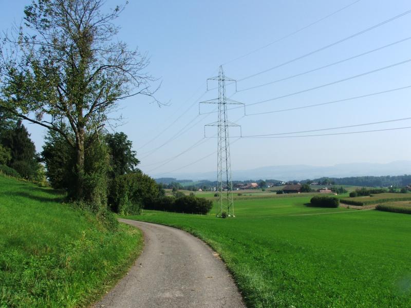 Bachbett entlang ab, hinüber zur Starkstromleitung. In Hildisrieden bleibe