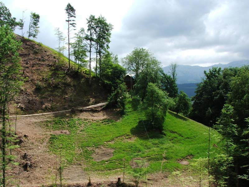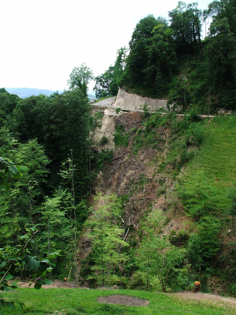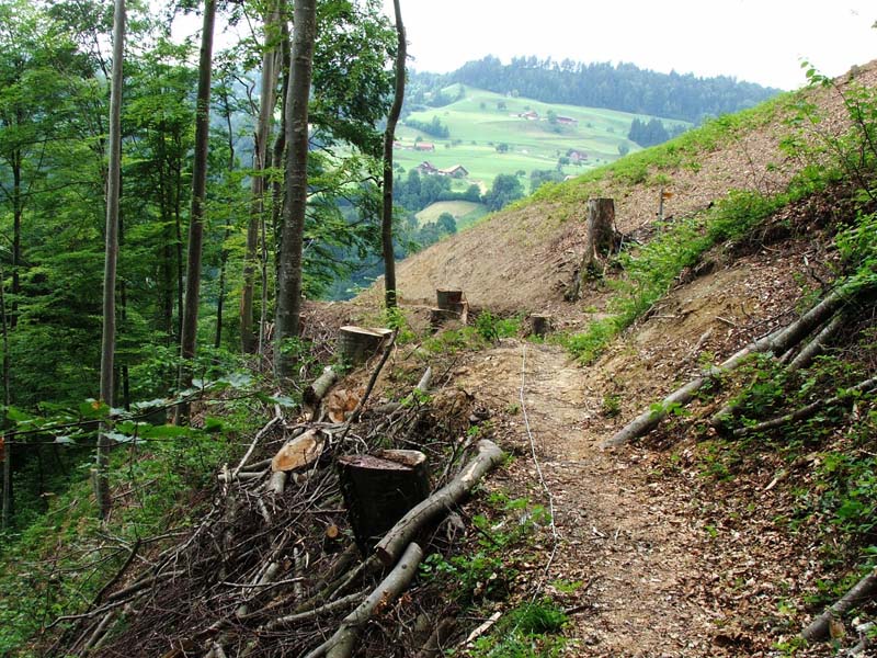 Kurz vor Näbdeflue wird der Weg schmal und bald ist klar, dass er nicht mehr oft begangen ist. Ein grosser Erdrutsch hat den ganzen Hang in die Tife gerissen. Der Pfad ist zwar noch mit einem Plastik-Kabel gesichert, kurz nach der Abriss-Stelle stossen wir dann auf den neu angelegten Weg via Tschäpperslehn (auf der Karte oben hellrot eingezeichnet). |