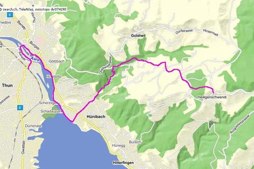 01.5.09 - Heiligenschwendi Schwendi Alpenblick 1102m - Schulhaus 1009m (0.20h) - Dörfli 941m - Steg Cholere 800m (0.30h) - Cholerenschlucht - Hünibach 560m (1h) - Thun (0.35h) - 2.25h - 8.5 km Diese Etappe folgt nicht der offiziellen Alpenpanoramaroute. GPS-Tracks und Karte |