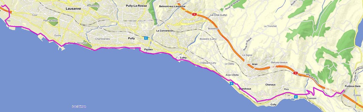 | Puidoux-Chexbres, gare | A9, SBB-Linie und die Spur hinunter nach Vevey | Le Lavaux, Epesses | |