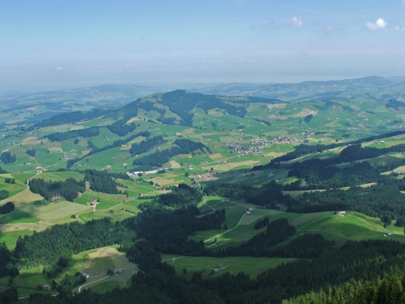 Während die Original-Alpenpanoramaroute von Urnäsch zur Schwägalp führt (auf der vergrösserten Karte blau), wählen wir die Variante über den Kronberg. Von der Bergstation aus sehen wir zurück zum Bodensee und vorwärts Richtung Toggenburg. | ||