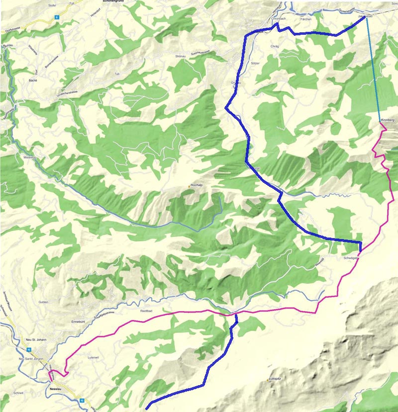 21.6.08 - Jakobsbad Jakobsbad 869 m - Kronberg 1663 m (Seilbahn) - Schutzenölpli 1366 m - Chammhalden 1394 m - Schwägalp 1352 m (2h) - Luttertannen 1030 m (1h30) - Nesslau 759 m (2 h) - ca. 20 km, 5 h Diese Etappe folgt teilweise nicht der offiziellen Alpenpanoramaroute. GPS-Tracks und Karte |